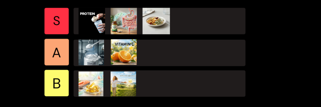 今回は、複数種目のハードなトレーニングをこなしながらも、無駄な思考・出費を抑えてパフォーマンスを最大化させるための「厳選サプリメント7種」を、**優先度別のティアランク(Tier表)**にして公開します。 高コスパなおすすめ商品も合わせて紹介していますので、ぜひサプリ選びの参考にしてみてください!