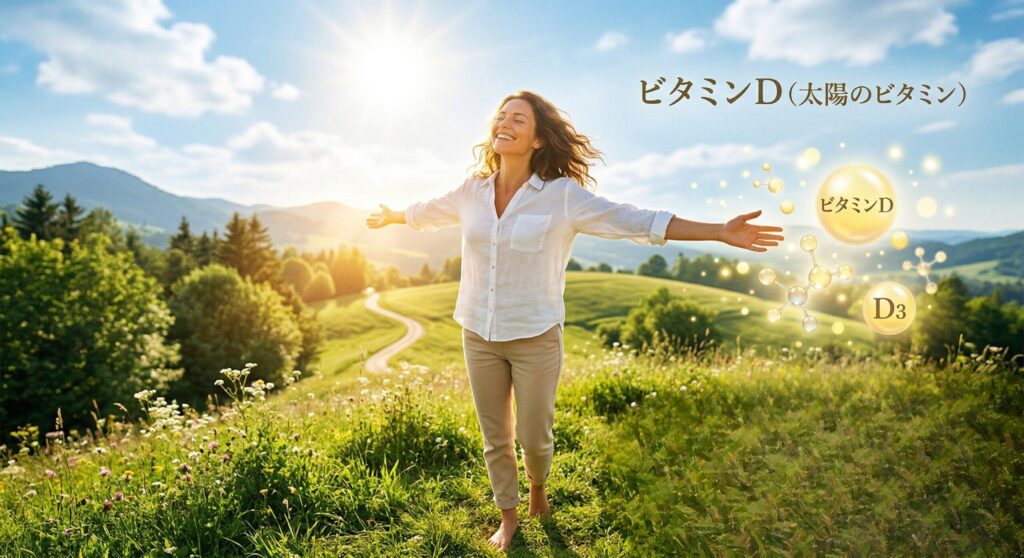 「太陽のビタミン」とも呼ばれ、カルシウムの吸収を助けて強靭な骨を作るだけでなく、筋機能の維持にも関わっています。日焼け止めをしっかり塗る人や、室内での活動時間が長い現代人は不足しがちなので、サプリで安価に補ってコンディションを整えるのが賢い選択です。