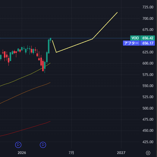 チャートはS&P500に連動するETF(VOO)、3月で調整が入ったので、4月から年末にかけてじわじわ上昇すると予想しています。