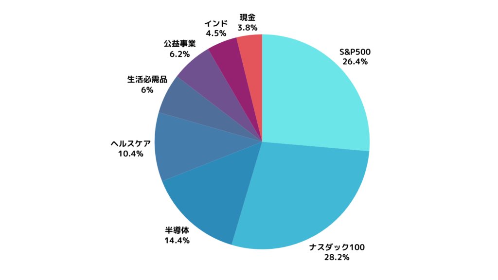 先月までにQQQMへの買い増しを積極的に行ったため、現金比率は低水準を維持しています。