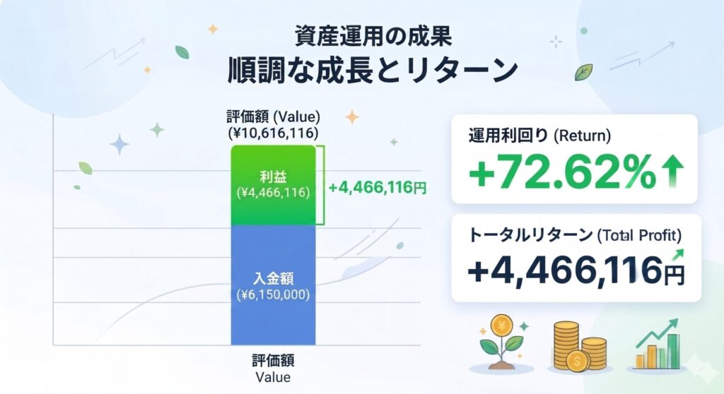 積立投資5年目、2026年4月下旬(4/25時点)の運用状況です。 今月中旬に総資産1,000万円を突破したばかりですが、勢いは止まらず現在の総資産額(現金含む)は 10,616,116円 となりました 。相場の波に乗り、資産の増加スピードが一段と加速しています。
